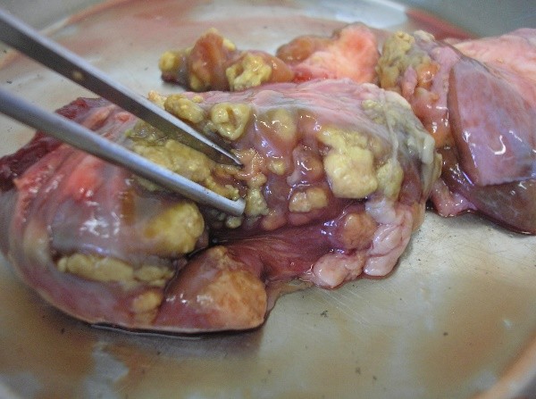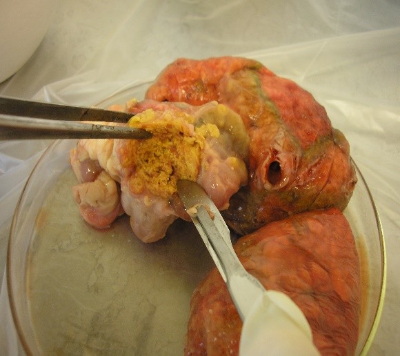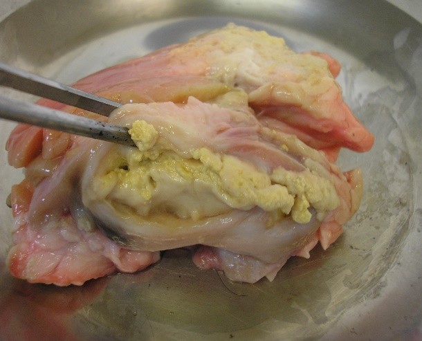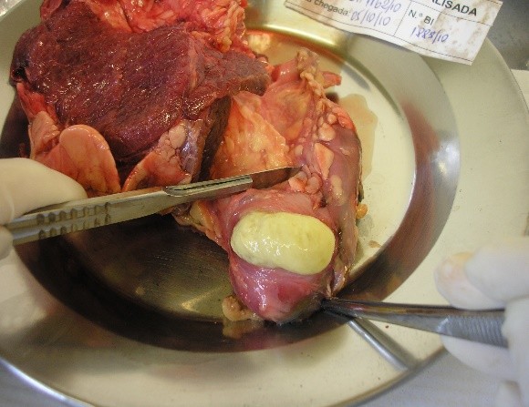 b) Dentro da Cabine de Segurança Biológica (CSB), abrir o frasco da amostra e, com a ajuda de uma pinça, colocar o tecido em um prato de alumínio/placa de Petri e avaliá-lo macroscopicamente para verificar a presença e as características das lesões (figuras 1, 2 ,3 e 4). Em seguida, com auxílio de pinça e bisturi, deve-se seccionar o tecido em pequenos fragmentos.