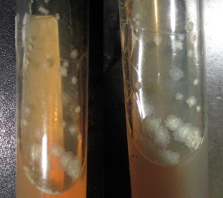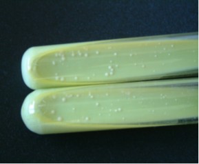 Verificar, semanalmente, se houve crescimento de UFC típica em algum tubo de meio incubado e registrar o resultado observado. As características das UFCs de M. bovis em meio de cultura Middlebrook 7H11 são: aspecto rugoso, bordas irregulares e cor acastanhada, aparecem aproximadamente a partir da segunda semana, sendo mais visíveis a partir da terceira semana (Figura 5). Em meio de cultura Stonebrink (SB) as características das colônias são: arredondadas com bordos regulares ou não, às vezes em forma de ovo frito, cor creme e brilhante, aparecem aproximadamente a partir da terceira semana, sendo mais visíveis a partir da quinta semana (Figura 6).