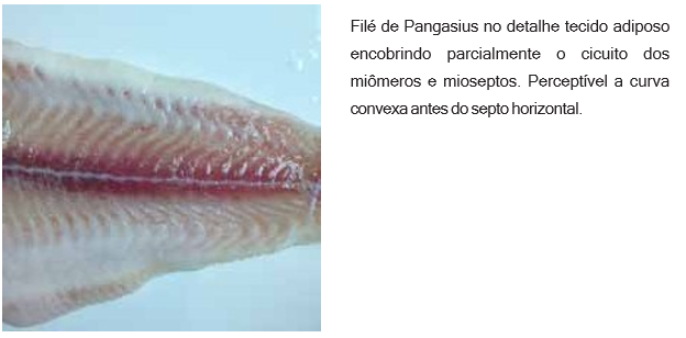 a. Cor e Aspecto: clara ao rosado. Linhas rosáceas a avermelhadas de diferentes intensidades sobre os miômeros. Carne muito branca na cocção e sabor suave característico. Em alguns casos pode ser perceptível sabores e odores indesejáveis associados a “off flavor” em decorrência de MIB e Geosmina. Ausência de acúmulo de gordura subcutânea e no ventre nos filés da maneira como ocorrem nos siluriformes criados em cativeiro. Conformação morfológica do filé nem longilínea, nem geométrica. Tendência elipsoidal com pedúnculo reduzido;