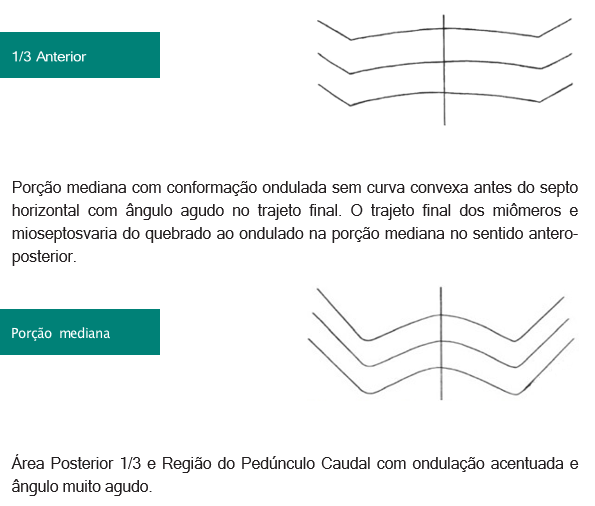 Porção Posterior 2/4 de conformação muito ondulada com pequena hipérbole invertida com curva convexa suave pouco perpectível antes do septo horizontal. Trajeto final dos miômeros e mioseptos ondulado e ângulo final muito agudo. Porção 3⁄4 a curva convexa antes do septo horizontal fica pouco perceptível e não bem demarcada.