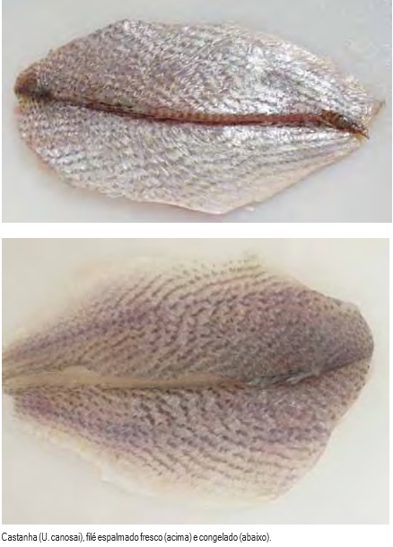 a. Cor e Aspecto: conformação dos filés geométrica triangular escaleniforme. Cor clara nos filés frescos e rosácea ao ocre amarelado nos filés congelados;