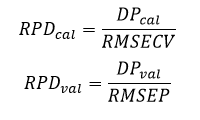 Relação de desempenho do desvio (RPD – residual prediction deviation): útil para comparar modelos em diferentes conjuntos de dados, ou em termos absolutos. RPD é a razão entre a variação natural das amostras e o tamanho dos erros prováveis que ocorrem durante a predição. A RPD é estimada para os conjuntos de calibração (RPDcal) e validação externa (RPDval), de acordo com as equações abaixo: