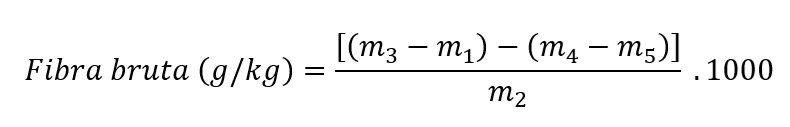 A fibra bruta é determinada gravimetricamente como o resíduo insolúvel obtido após duas etapas de hidrólise em meio aquoso, sob ebulição: uma ácida (com ácido sulfúrico), outra alcalina (com hidróxido de potássio ou hidróxido de sódio). Essas etapas de digestão quebram ligações de proteínas, lipídios e carboidratos, produzindo espécies químicas de estruturas menores, solúveis em meio aquoso. Após incineração, a massa do resíduo insolúvel, composto principalmente por celulose e lignina insolúvel em meio alcalino, corresponde à fibra bruta, quantificada por diferença da massa inicial da amostra.