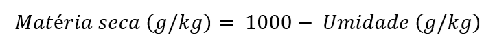Amostras sólidas com menos de 850 g/kg de matéria seca (umidade superior a 150 g/kg), destinadas às análises físico-químicas, deverão ser submetidas a uma etapa de pré-secagem (antes da moagem), para minimizar a potencial alteração do seu teor de umidade durante sua moagem e armazenamento. Nesses casos, os resultados das análises deverão ser expressos com a observação “amostra submetida à pré-secagem” e serão multiplicados por um fator de correção (Fc), calculado de acordo com a equação abaixo:
