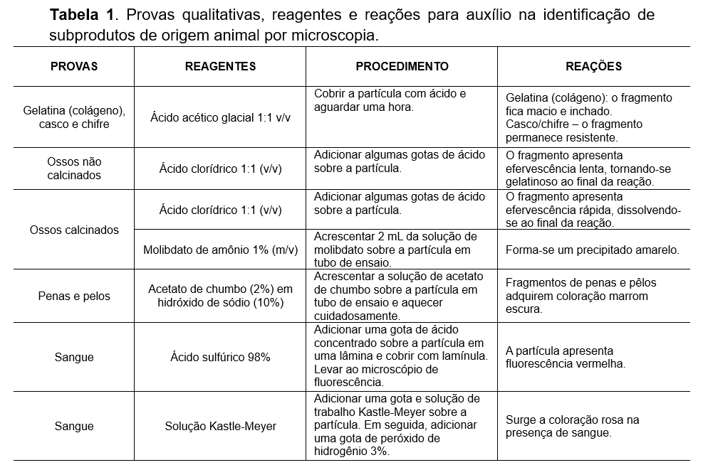 Este método baseia-se na detecção e identificação microscópica de subprodutos de origem animal conforme tamanho, forma, cor, textura, dureza, brilho e outras características de seus fragmentos, com auxílio de testes físico-químicos qualitativos.